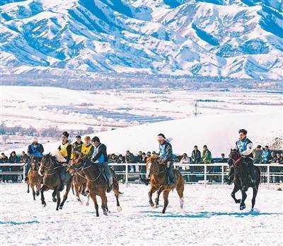 新疆昌吉回族自治州吉木萨尔县大有镇将民族风情与体育运动相融合,举行叼羊、赛马、“头羊争霸”等具有民族风情的竞技项目和趣味活动,吸引了众多游客前来体验。图为大有镇村民在进行叼羊比赛。 何 龙摄(影像中国)