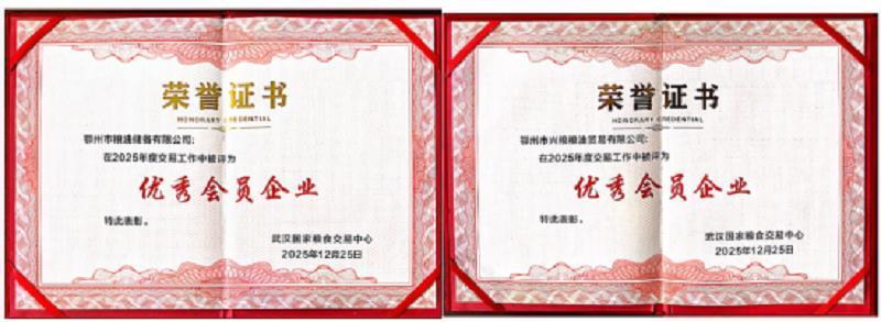 2025年12月25日,在武汉国家粮食交易中心举办的“2025年会员服务暨市场形势分析会”活动上,鄂州市粮油储备有限公司及下属子公司鄂州市兴粮粮油贸易公司凭借扎实的业务能力与突出的行业贡献,双双获评全省2025年度粮食交易工作“优秀会员企业”。这是鄂州市粮油企业首次荣获此项行业殊荣。