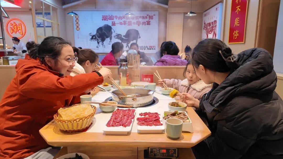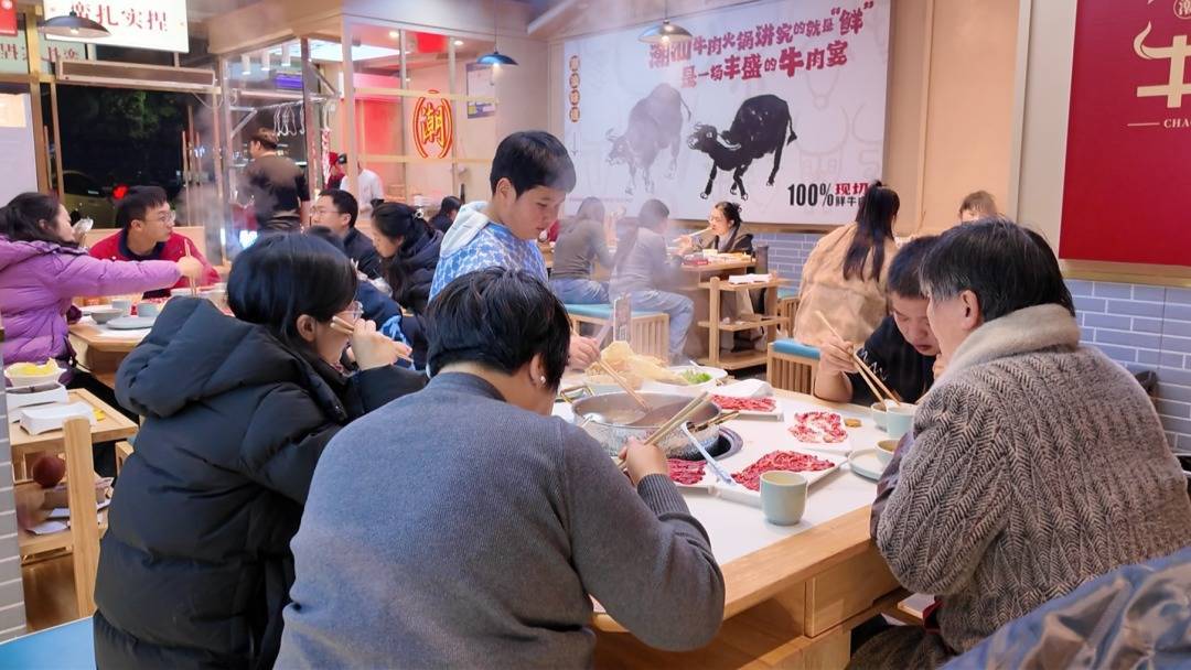 餐饮业态也在低温催化下迎来热潮。傍晚时分,城区多家火锅店、烧烤店座无虚席,蒸腾的锅气与喧闹的人声交织,烘托出浓郁的市井暖意。“入冬后客流增长明显,加上节假日返乡人员回来,生意比之前更旺了。”牛鲜生潮汕鲜牛肉火锅枝江店店长覃彬说。