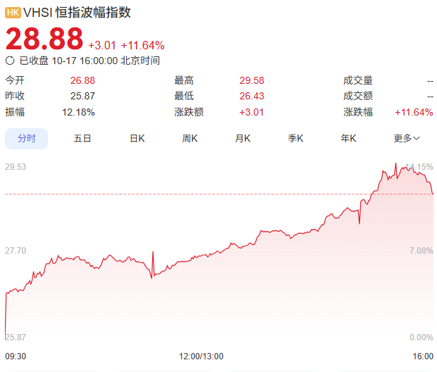 上证报中国证券网讯(李子健记者周亮)10月17日,有香港市场恐慌指数之称的恒指波幅指数,今日一度涨超14%,后回落至11.64%,收盘报28.88点,突破了10月14日创下的27.22点前期新高。