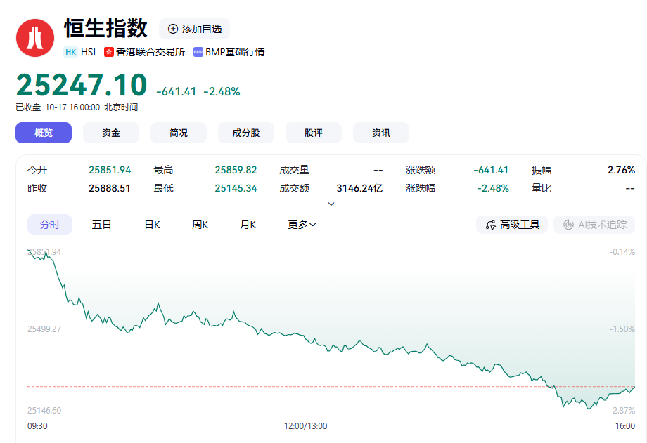 恒生指数低开低走,收盘跌2.48%。港股中兴通讯、比亚迪电子、华虹半导体跌幅居前,跌幅分别为12.83%、8.13%及6.94%。