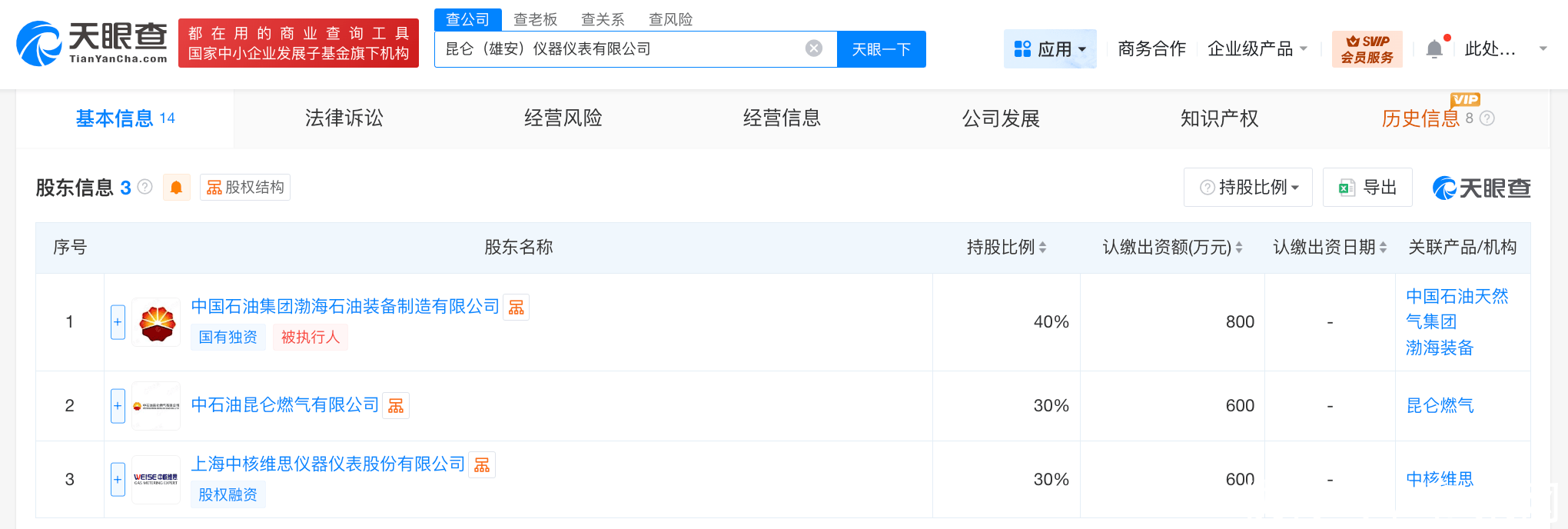 天眼查App显示,近日,昆仑(雄安)仪器仪表有限公司成立,法定代表人为何志伟,注册资本2000万人民币,经营范围含智能仪器仪表制造、智能仪器仪表销售、集成电路制造、集成电路销售、集成电路设计、电子产品销售、通信设备制造、通信设备销售、计量技术服务、信息技术咨询服务等。股东信息显示,该公司由中国石油集团渤海石油装备制造有限公司、中石油昆仑燃气有限公司、上海中核维思仪器仪表股份有限公司共同持股。