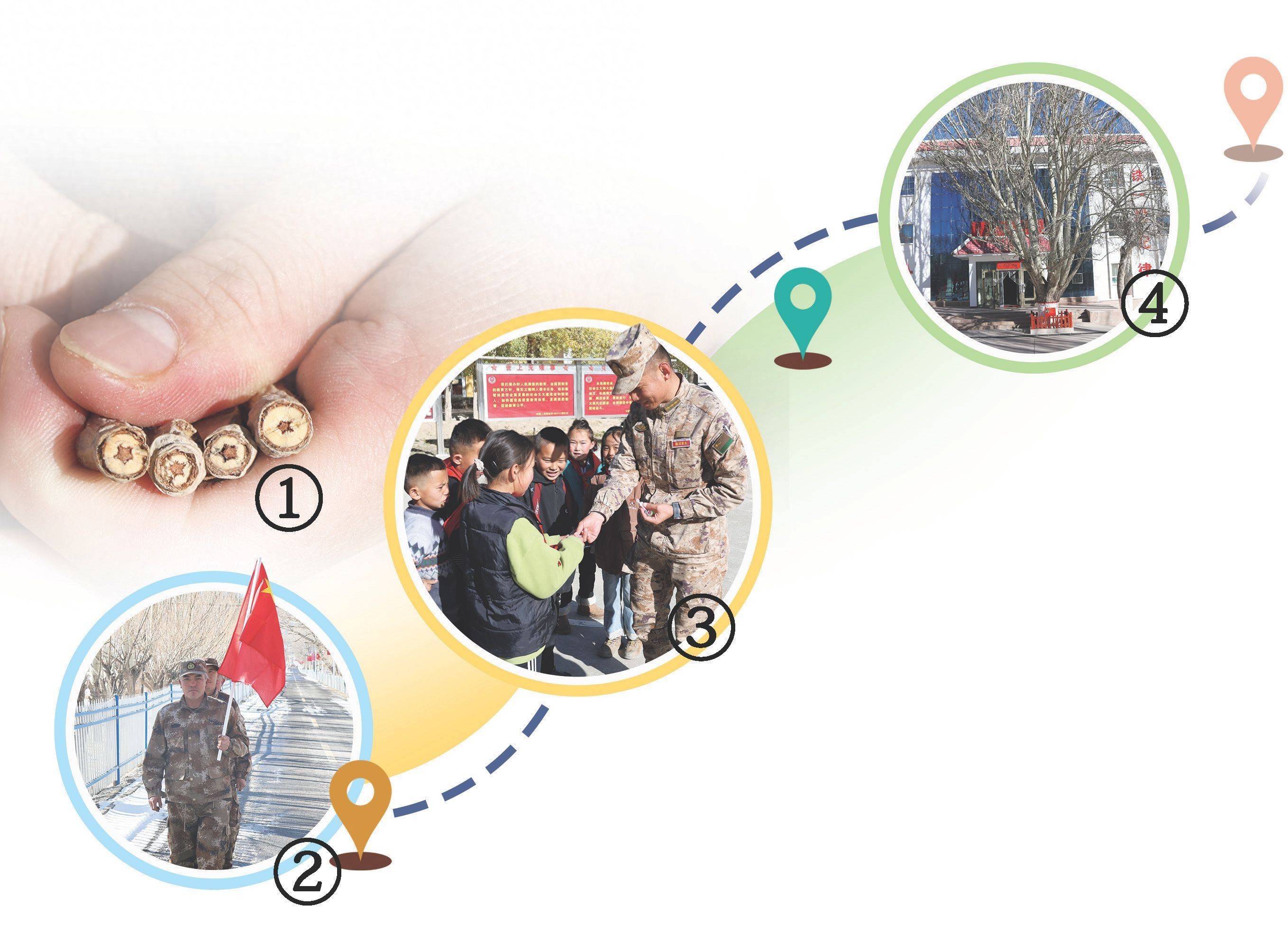 图①:迈丹边防连战士展示“五星杨”树枝横截面。褚晨阳摄 图②:迈丹村护边员巡逻途中经过戍边爱民林。陈圣圣摄 图③:来自迈丹边防连的校外辅导员在迈丹小学与学生做游戏。陈 斌摄 图④:迈丹边防连营区门口的“五星杨”。韩佳静摄